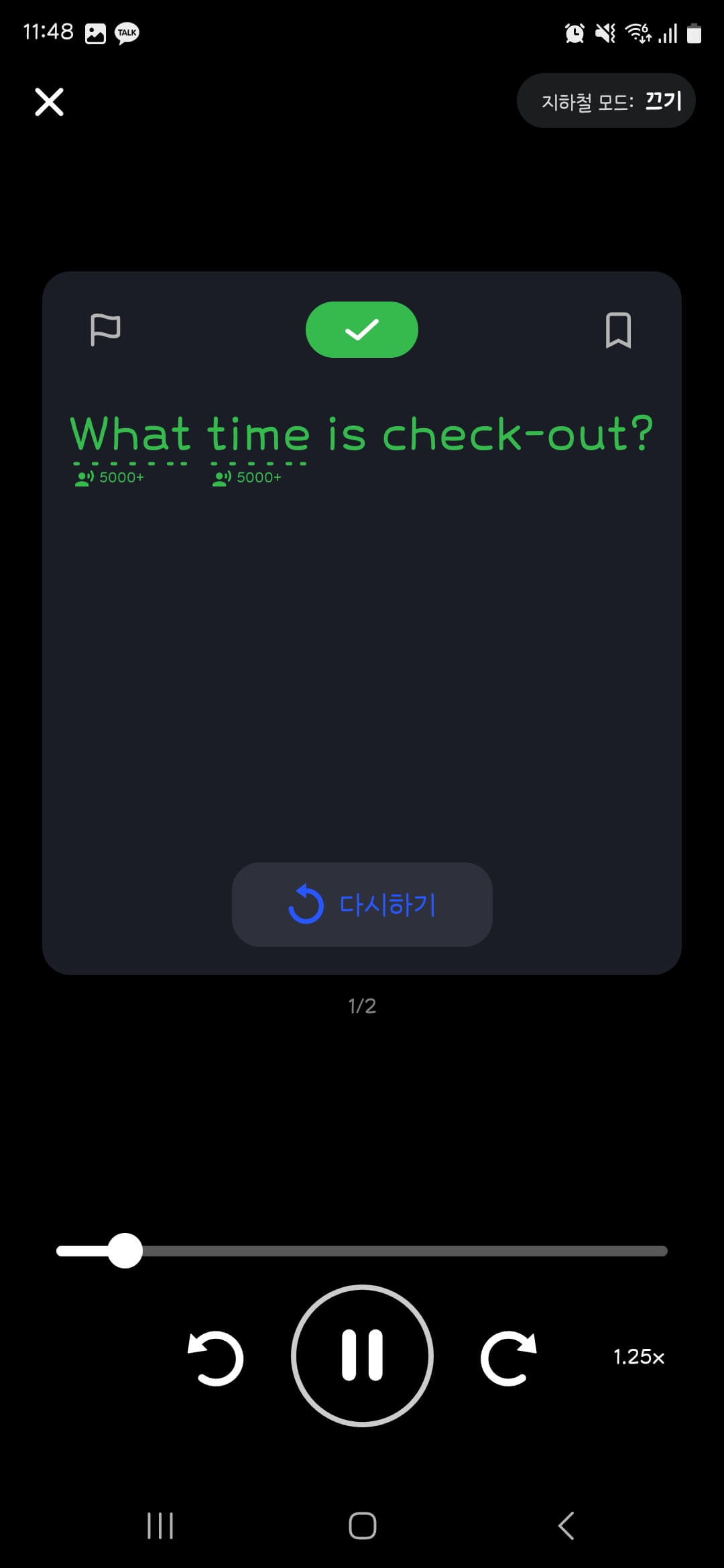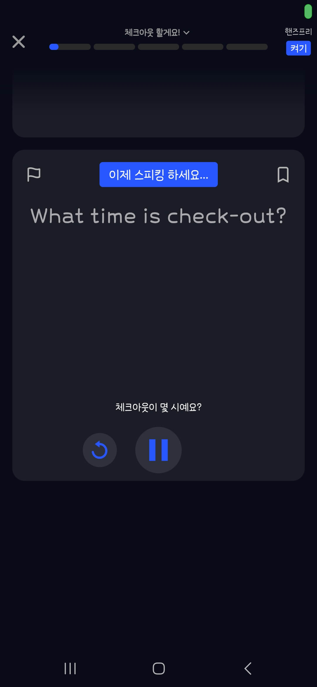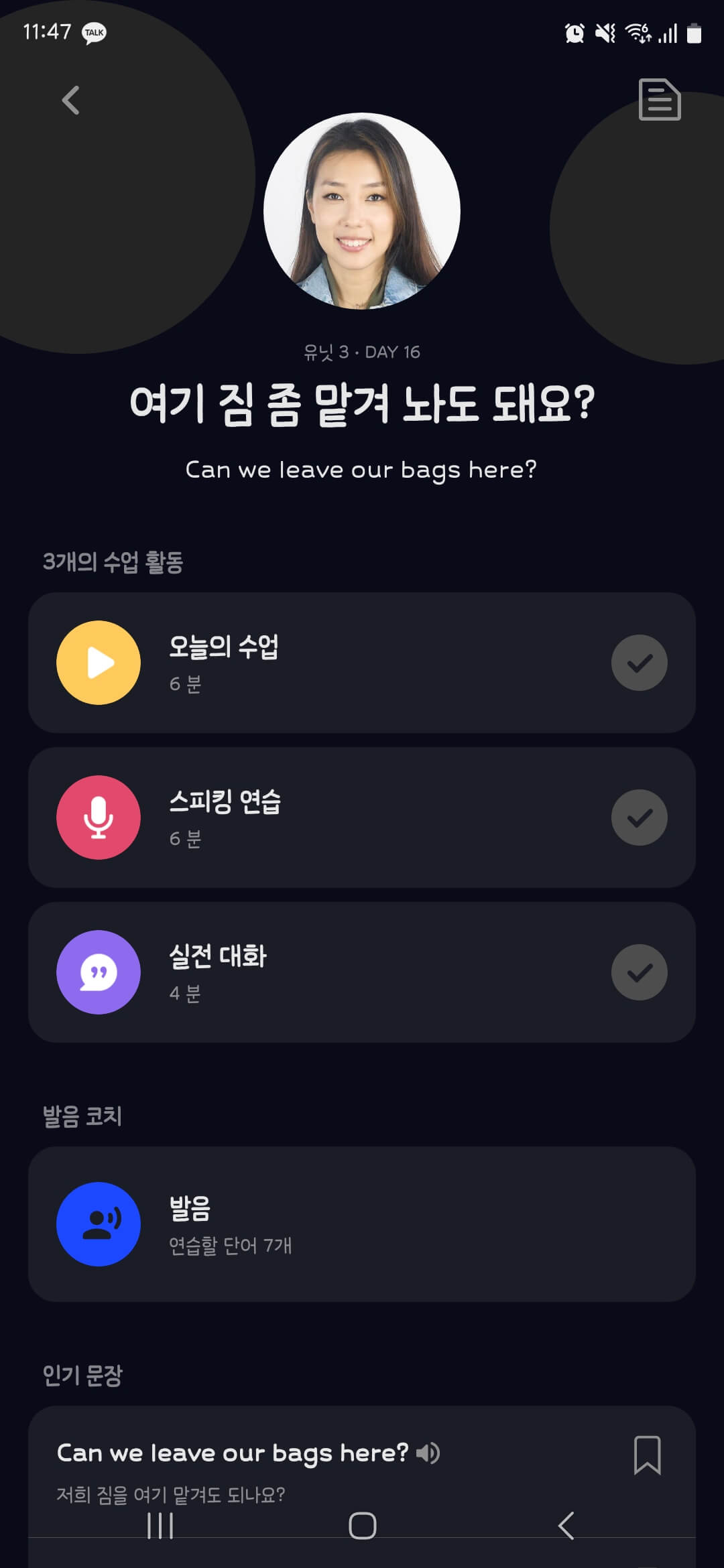 <실전대화>는 원어민이 영어로 질문하고(한글 자막 나옴) 오늘 배운 문장으로 대답하며 복습하는 챕터이다.